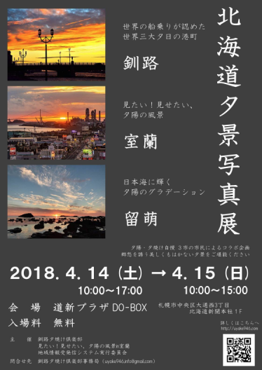 釧路、室蘭、留萌という夕陽・夕焼け自慢3市のコラボ写真展を札幌市で開催します。